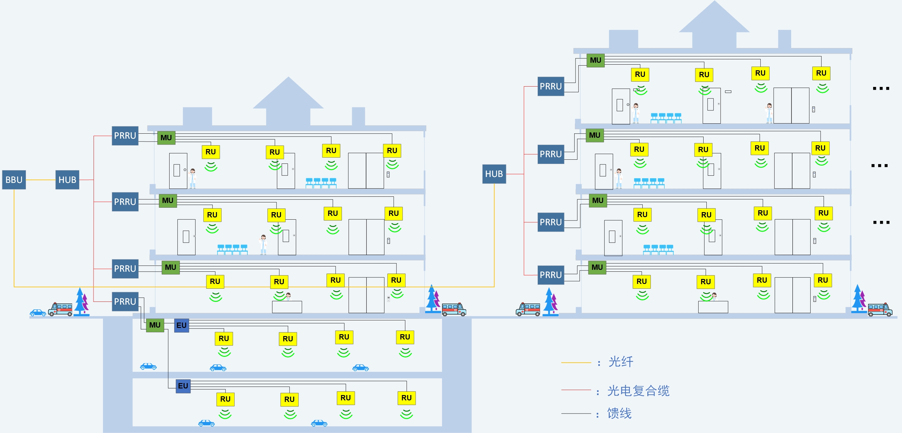 双路移频MIMO室分系统系统由主机单元、覆盖单元和一分四扩展单元三部分组成,主机单元将两路NR信号变频后分4路输出,通过新建的单路柔性线缆以及专用功分器将信号拉远至不同点位,最后通过覆盖单元将两路变频信号还原覆盖,适用于新建5G双流的室内分布场景。